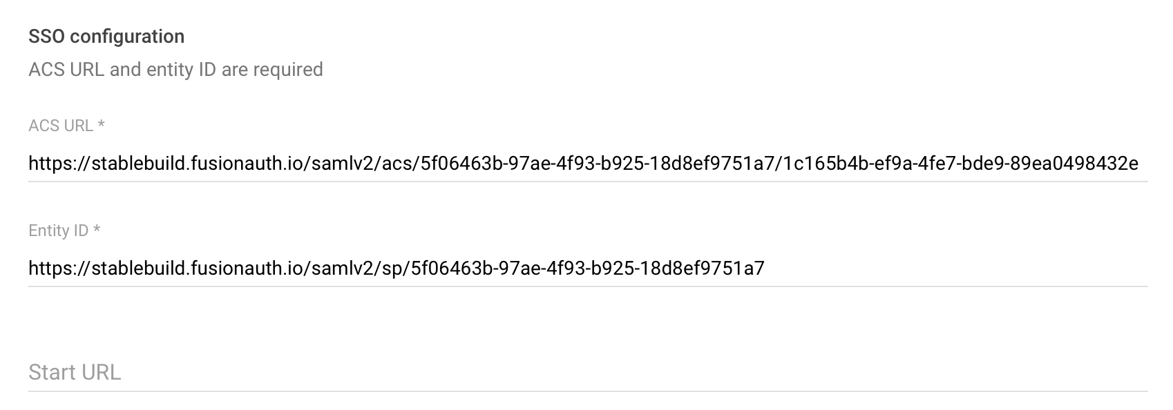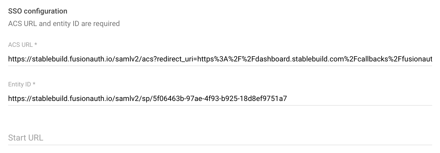 • Callback URL (ACS): https://stablebuild.fusionauth.io/samlv2/acs